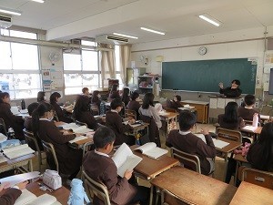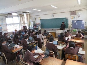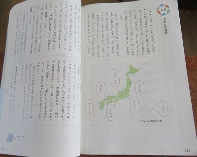 「方言と共通語」。児童端末で自分が選択した地域の方言を調べています。調べた後は写して発表ノートで発表します。
