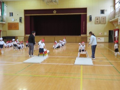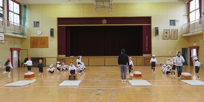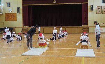 1年生は、講堂で跳び箱の練習をしています。開脚跳びです。