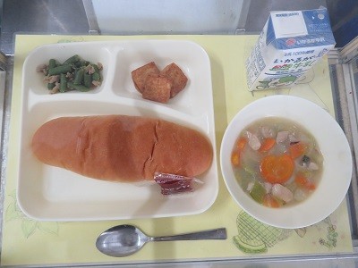 今日の献立は、はくさいのとろみ煮、あつあげのピリ辛じょうゆかけ、豚肉とさんどまめのオイスターソースいため、コッペパン、牛乳、いちごジャムです。