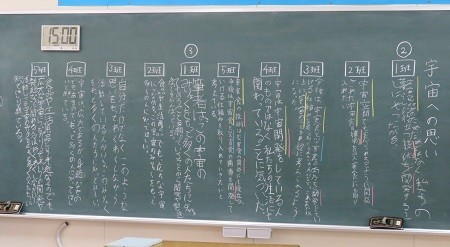 「食品からつながる宇宙」。宇宙への思いを段落ごとにまとめて班ごとに板書しています。使われている共通のことばをさがしています。