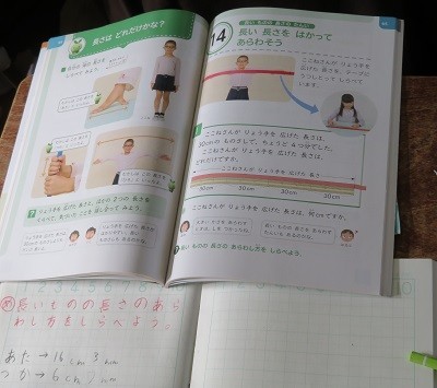 「長い 長さを はかってあらわそう」。両手を広げた長さなどの長い長さを測って調べます。