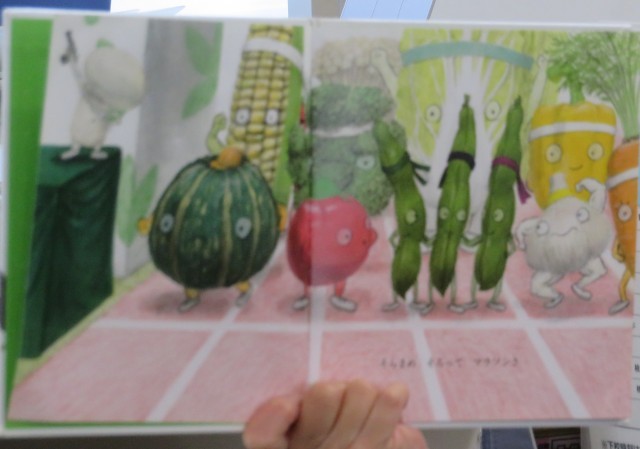 「おやおや おやさい」の読み聞かせです。出てくるやさい名を早口でいったりリズムをかえたりしてそれを子どもたちもまねをして読みながら進めています。