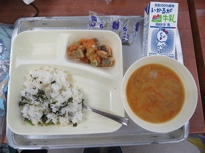 今日の献立は、こまつなっ葉めし(きざみのり)、さけの和風マリネソースかけ、じゃがいもとベーコンのみそ汁、牛乳です。今日のメニューは、「学校給食献立コンクール優秀賞作品」です。東成区の中本小学校のみなさんが考えたメニューです。