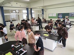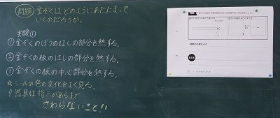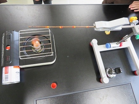 「金ぞくはどのようにあたたまっていくのだろうか」。カセットコンロで金ぞくのぼうの端を加熱すると、熱が伝わり、金ぞくぼうに巻いたテープが次第に赤く変色していきます。