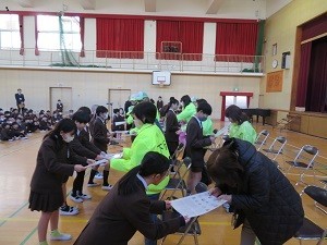今朝講堂で「地域のみなさんに感謝する集会」を行いました。朝夕の見守り活動や「読み聞かせ」「昔あそび」などの学校と地域の連携した活動で日頃お世話になっている地域の方々に感謝の気持ちを伝える集会です。