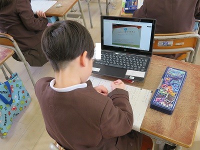 「子どもをまもるどうぶつたち」。ほかのどうぶつたちのちえをしらべるために、学習端末を使って、まとめています。