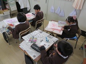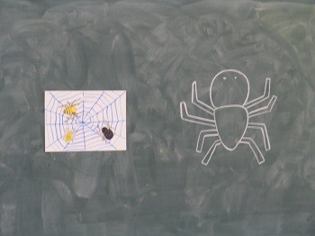 くもの巣とくもを別々の紙に書いています。できあがったらくもの巣の上にくもを貼り付けて立体的な作品になります。