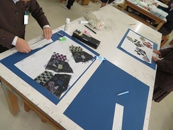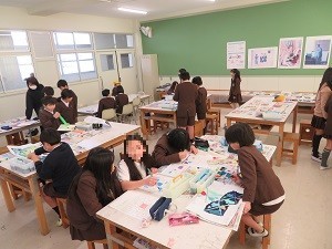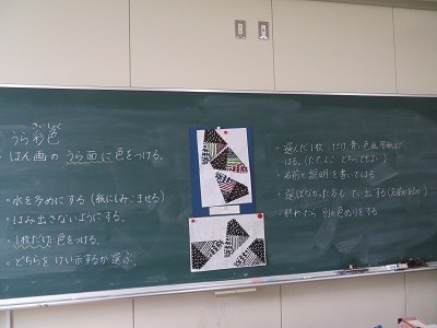 版画の裏面に色を付けて仕上げています。終わった人は水彩絵の具で色分けデザインをしています。
