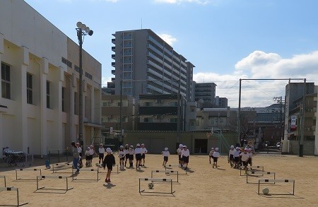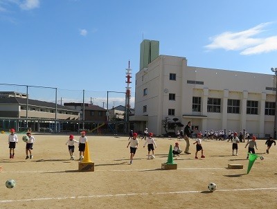 運動場でサッカーです。1組は段ボール箱の上にのせたコーンを落とすことを目標に、2組はハードルの中を通すことを目標にボールをけっています。