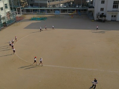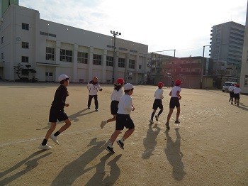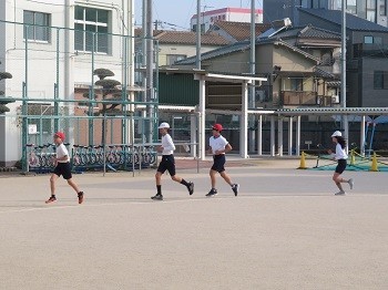 運動場で10分走です。1時間目はまだ肌寒いですが、しっかり走っています。