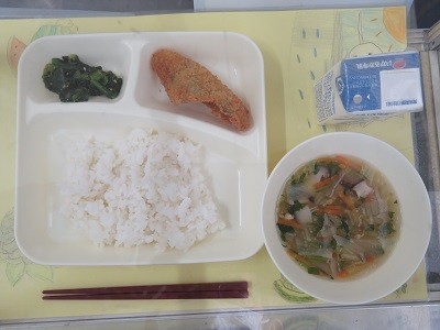 今日の献立は、たらフライ、うすくず汁、こまつなのごまあえ、ごはん、牛乳です。