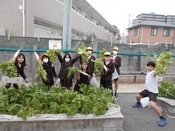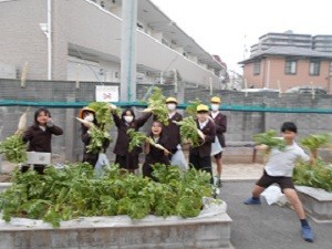 環境整備委員会の児童の希望者が学校園のダイコンの収穫をしました。小ぶりの大根でしたが、自分で収穫した大根を喜んで持って帰りました。