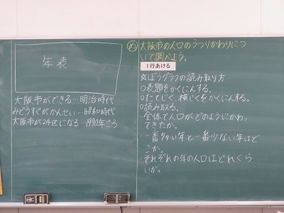 大阪市の人口のうつりかわりをグラフや大阪駅のようすなどを参考に学習しました。