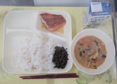 今日の献立は、あかうおのレモンじょうゆかけ、みそ汁、牛ひじきそぼろ、ごはん、牛乳です。