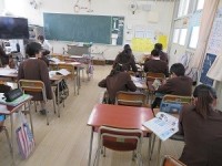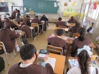 運動場で5分間走です。何周走ったか記録しています。運動場は風はないけど少し肌寒く感じます。
