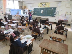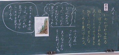 「スイミー」のお話で、主人公が岩に隠れて考えている場面です。児童が教卓の後ろに隠れて自分で考えた主人公の気持ちを言っています。