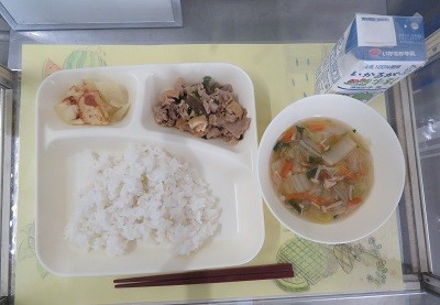 今日の献立は、豚肉と干しずいきのみそ煮、五目汁、焼きじゃが、ごはん、牛乳です。