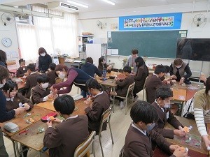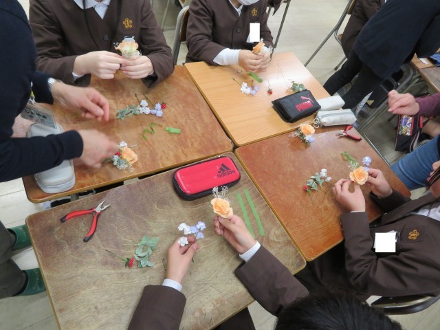 地域の方々のご指導で卒業式用のコサージュづくりをしました。丁寧に教えていただき、順調にできあがりました。