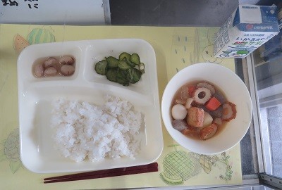 今日の献立は、関東煮、きゅうりの梅風味、とら豆の煮もの、ごはん、牛乳です。