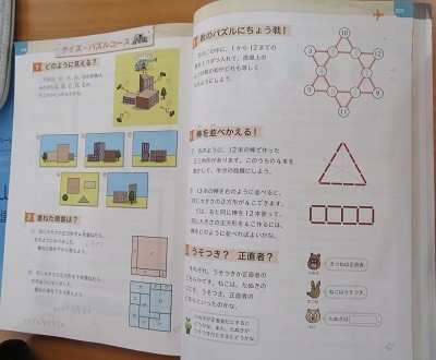 算数の教科書の「クイズ・パズルコース」の問題を頭をひねりながら解いています。