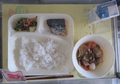 今日の献立は、さごしの塩こうじだれかけ、さといもと野菜の含め煮、なのはなのおひたし(かつおぶし)、ごはん、牛乳です。
