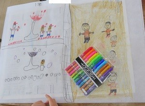 作品入れの袋のデザインを色付けして仕上げています。