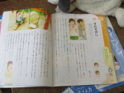 「すれちがい」。電話で会う約束をした二人は約束通りうまく会えずに仲たがいをしてしまいます。二人の会話の役割演技を児童が前に出てきてしています。