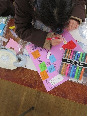 「わくわく思い出すごろく」。下書きをもとに色紙をつかって仕上げていきます。