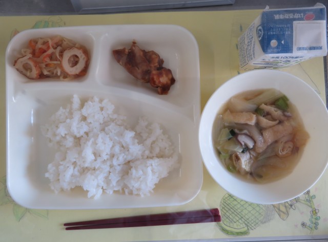 今日の献立は、鶏肉の八丁みそだれかけ、五目汁、切り干しだいこんのいため煮、ごはん、牛乳です。