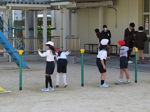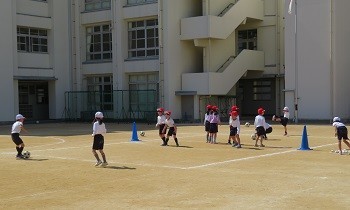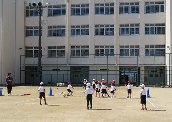 てつぼうで前回りなどをするグループと「たまごわりサッカー」のグループに分かれて、前後半交代で身体を動かしていました。