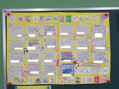 黒板に似顔絵を入れたり、一人ずつ担任の先生と通知票をもとに面談したりしています。