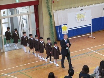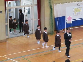 新入生が教室から講堂に元気よく入場して入学式が始まりました。