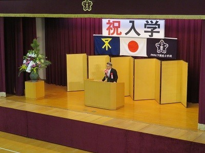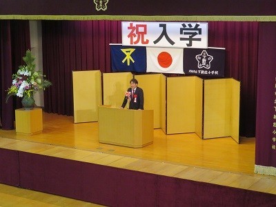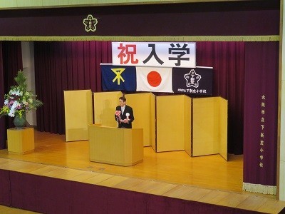 国歌・大阪市歌斉唱の後、校長先生から新入生に「元気にあいさつをしよう」「お話をしっかりきこう」とお話がありました。来賓の地域代表の方からは、「ドラえもんのようにみんなを守ってくれるたくさんの方々がまわりにいる」「しっかり食べて遊んで勉強してほしい」とのお話がありました。PTA会長からは、「ポケモンのようにいろいろなタイプの友だちと出会っていい友達をつくろう」とのお話がありました。