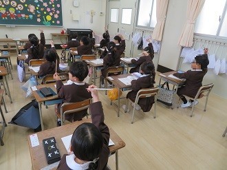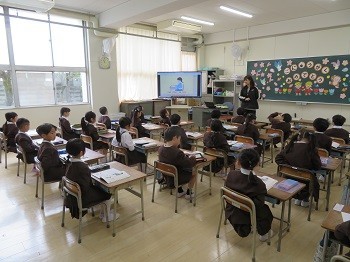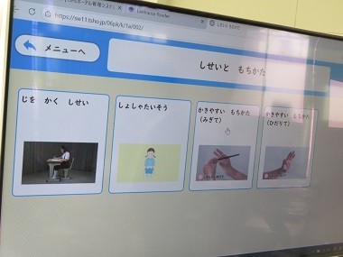3時間目はこくごです。すにすわるときや字を書くときの姿勢について学習しています。