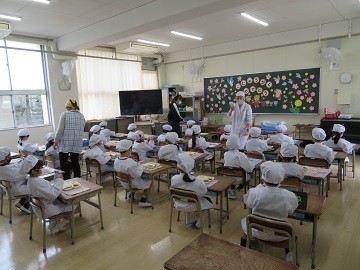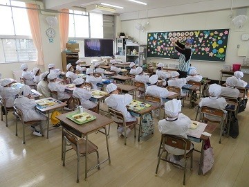 1年生は初めての給食ですので、給食当番の1年生はお手伝いの6年生といっしょに給食室に給食を取りに行きました。