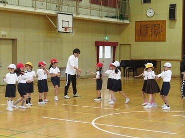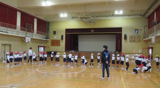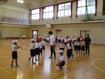 講堂で「ジャンケンゲーム」。楽しんでからだを動かしています。