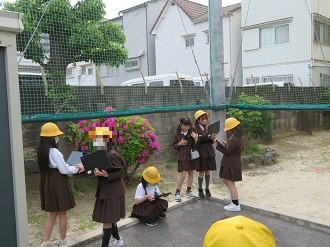 校庭の自然の観察です。校庭の花などを児童用端末で写真に撮っています。