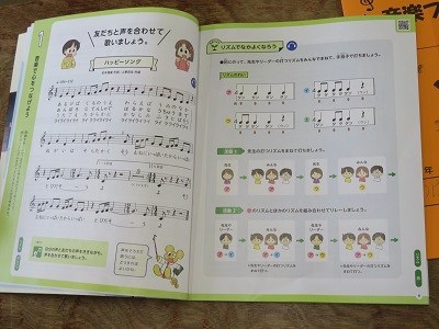 「友だちと声を合わせて歌いましょう」。「ハッピーソング」のリズムに合わせています。