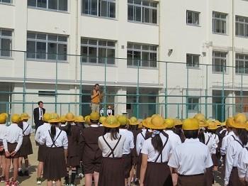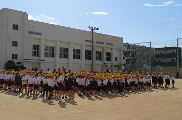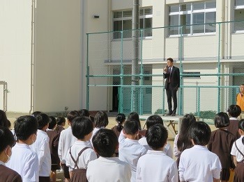運動場での児童朝会は今年度初めてです。校長先生からは、今週おこなわれる学力テスト(23日6年全国学力・学習状況調査、24日5・6年すくすくウオッチ)で最後まで自分の力を出しきって取り組んでほしいというお話と、地域の公園をきれいにしようというお話がありました。高学年児童の中には、地域の方の美化活動に協力したり、自分の出したごみ以外も持ち帰ったりして、地域の方にほめていただいた児童もいるそうです。