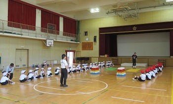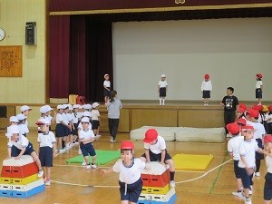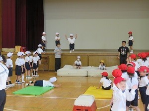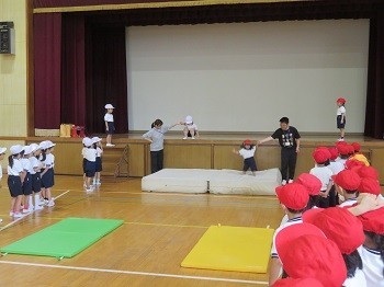 講堂でマットや跳び箱などを使った運動をしました。舞台からマットに飛び降りでマットでごろごろ、跳び箱にまたがって、最後にフラフープをくぐります。