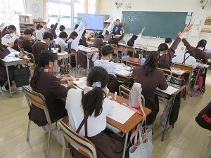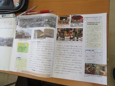 「くらしの中の平和主義」。日本国憲法の平和主義の考えは、市や国の生活にどのように反映されているのか、尼崎市の例を参考に学習しています。