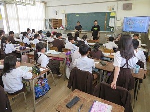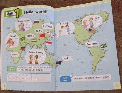 「Hello ,world!」 映像を見ながら世界の国々のあいさつについて学習した感想を発表しています。