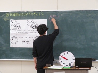 「時間のもとめ方を考えよう」。各自が時計の教材を手元において時間のもとめ方の学習をしています。