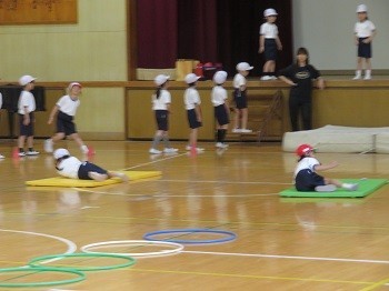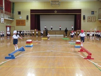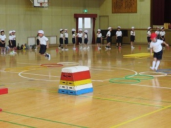 舞台からマットにジャンプ→マットでごろごろ→跳び箱にのって→フラフープをぴょんぴょん→平均台の上を歩いてゴールへ。