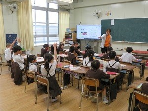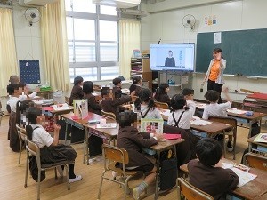 「ハッピーソング」という歌を「おはよう」「ありがとう」「さようなら」の手話の動作を取り入れて歌う練習をしています。