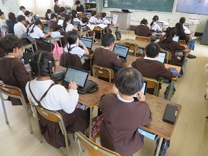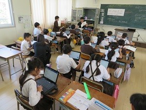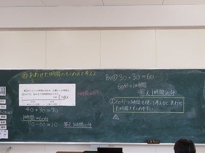 「合わせた時間のもとめ方を考えよう」。課題が終わって〇つけが終わった人は、児童用端末でナビマ(デジタルドリル)をしています。