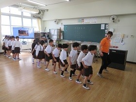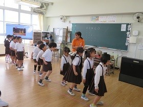 動作を入れた「かくれんぼ」のうたの後は、世界の音楽。フィリピン民謡のティニクリンを踊っています。
