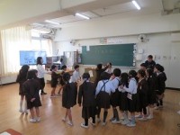 講堂での体育の授業です。競技前のストレッチの説明を聞いて練習しています。