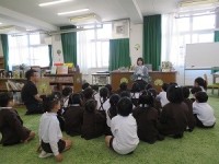 初めての図書館での授業です。司書の先生から図書館の使い方の説明をしてもらっていま...
