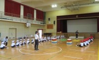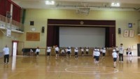 講堂でマットや跳び箱などを使った運動をしました。舞台からマットに飛び降りでマット...